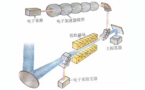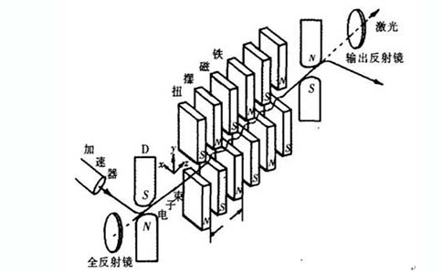 從加速器輸出的相對論電子束橫穿過周期性變化的波振器靜磁場。磁場方向與電子束垂直,故穿過的電子束被迫進行橫向振蕩,并向前方發(fā)射磁軔致輻射。在高能電子和光子的散射過程中,電子運動方向上的散射光子的頻率可由能量和動量守恒定律決定,波振器使聚焦的電子束在與光子束相互作用的整個過程中,始終保持在直線方向上。當(dāng)電子束和光子束密度足夠大時,便形成受激散射,產(chǎn)生自由電子激光。自由電子激光器的輸出激光波長與電子能量有關(guān),改變電子束的加速電壓就可以改變激光波長,這稱為電壓調(diào)諧。其調(diào)諧范圍很寬,原則上可以獲得任意波長的激光。