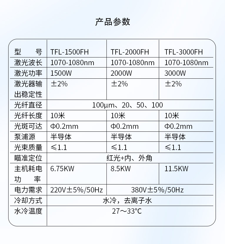 激光功率 | 1000W | 1500W | 2000W | 3000W |